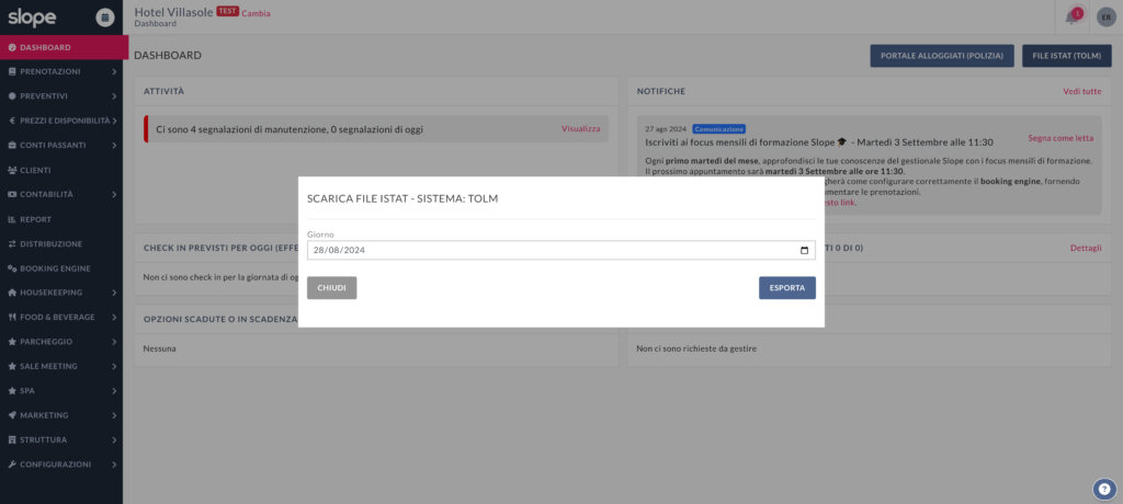 La sincronizzazione diretta dei dati ISTAT, quindi senza passare attraverso la compilazione manuale di un file, è solamente una delle tante funzionalità presenti nel PMS del gestionale Slope, come ad esempio la segnalazione della schedina alloggiati alla Polizia di Stato.