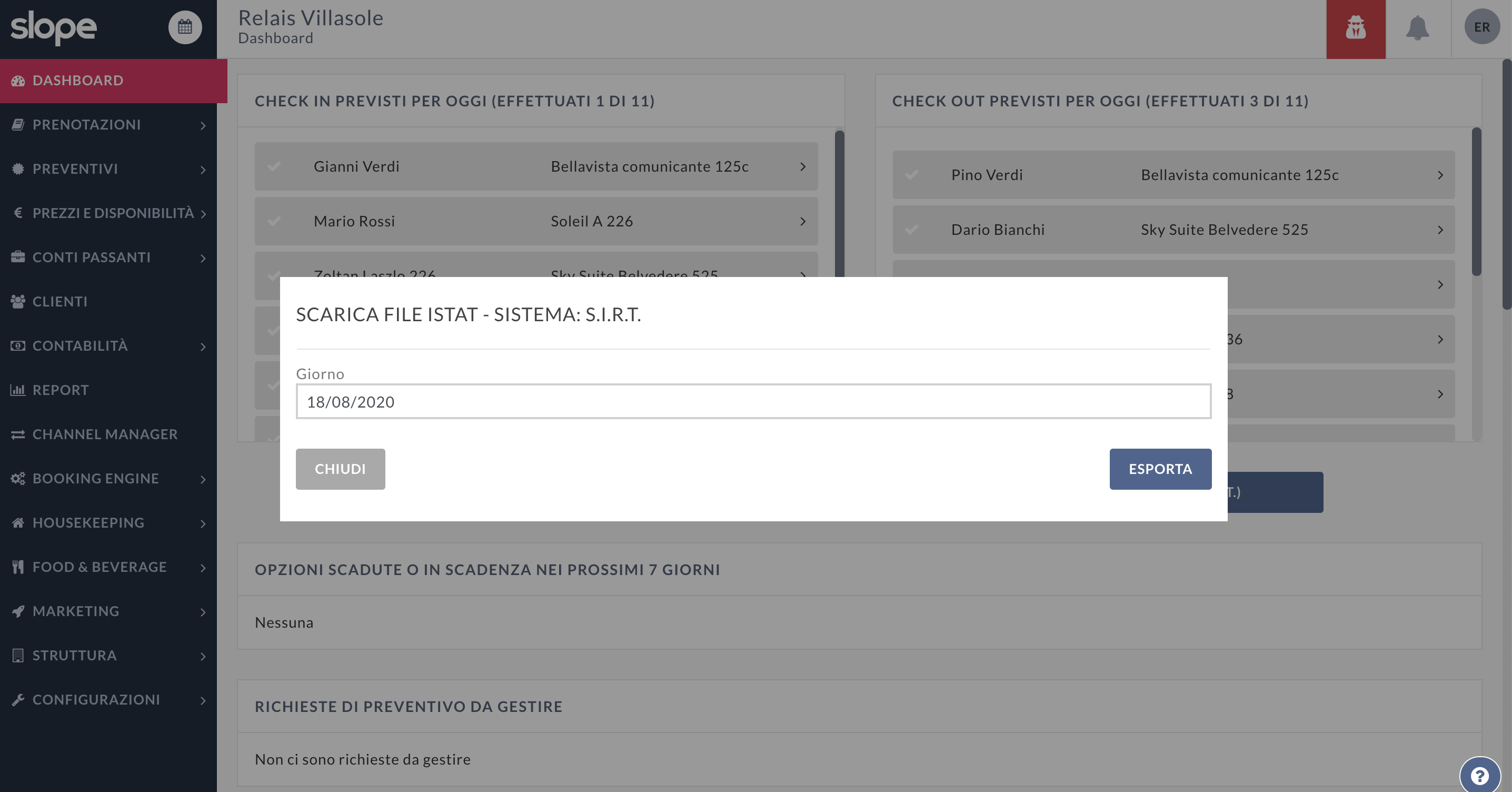La sincronizzazione diretta dei dati ISTAT, quindi senza passare attraverso la compilazione manuale di un file, è solamente una delle tante funzionalità presenti nel PMS del gestionale Slope, come ad esempio la segnalazione della schedina alloggiati alla Polizia di Stato.