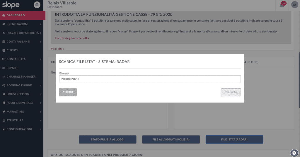 Nel caso in cui l’albergatore sia dotato di un software di gestione avanzata (come il gestionale Slope), allora il programma offrirà al gestore della struttura ricettiva un servizio di generazione di un file contenente un tracciato informativo interpretabile dal portale Radar.