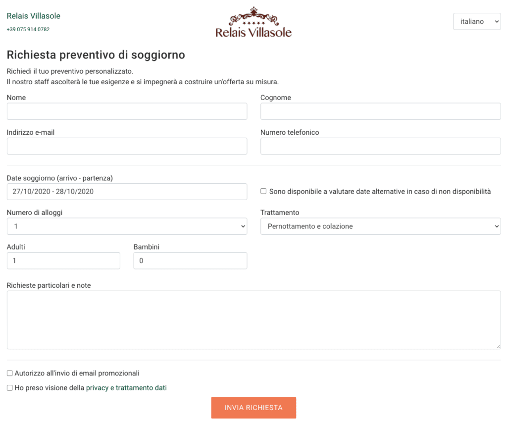 Oltre ai classici campi “nome, cognome, email, telefono, adulti, bambini” deve essere possibile far indicare all’utente il periodo in cui questo intende soggiornare, la tipologia di trattamento desiderata e la disponibilità a valutare anche eventuali date alternative.