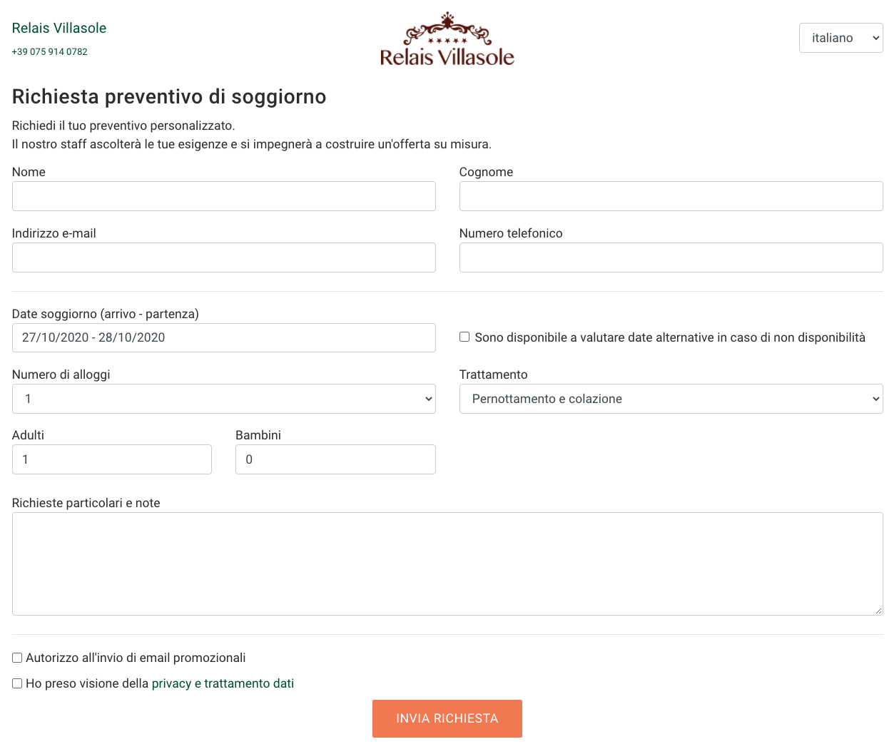 Il modulo di richiesta preventivo (o modulo di contatto) è composto da alcuni campi che l’utente che naviga il vostro sito web si trova a compilare per ottenere maggiori informazioni relativamente ad una richiesta di proposta di soggiorno.