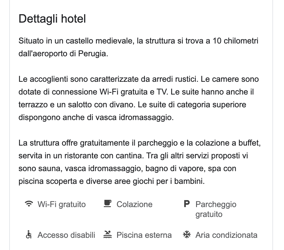 Ovvero tutte quelle caratteristi che che l’utente necessita di sapere nella scelta di un hotel per il proprio soggiorno. Se avete ulteriori dubbi vi rimandiamo alla guida di Google.