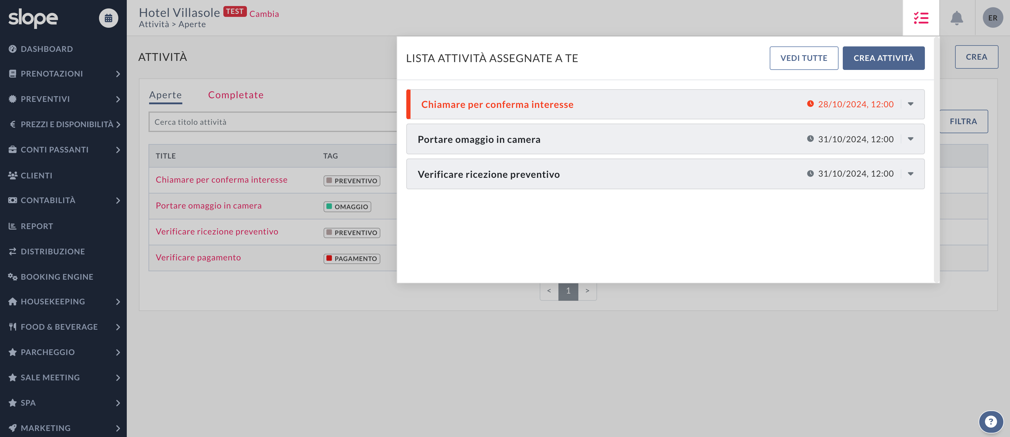 La funzionalità “Attività” è stata ideata per creare, assegnare e monitorare promemoria o richieste di intervento all’interno del gestionale per hotel.
