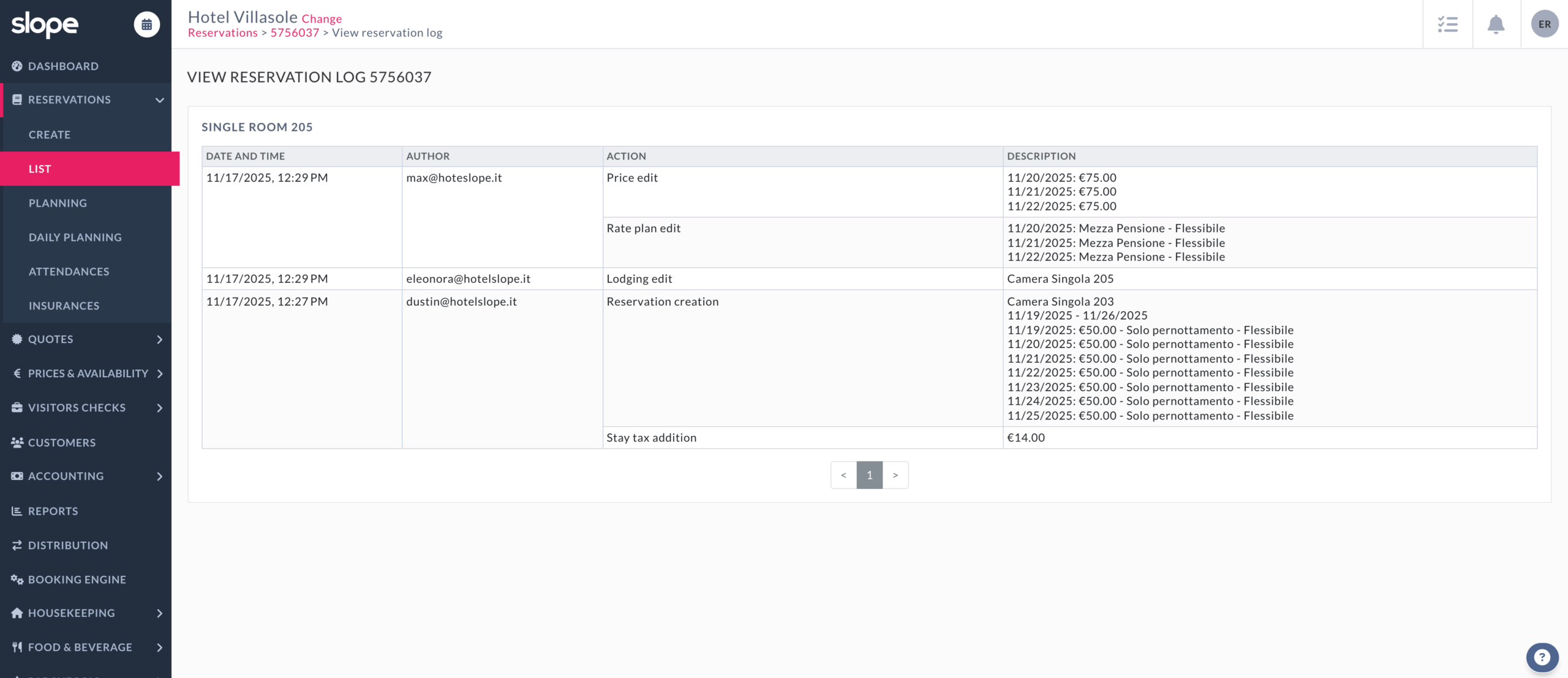 Slope records the main actions performed in the system, providing traceability for booking changes, extra services, and administrative operations.